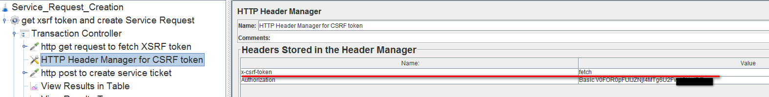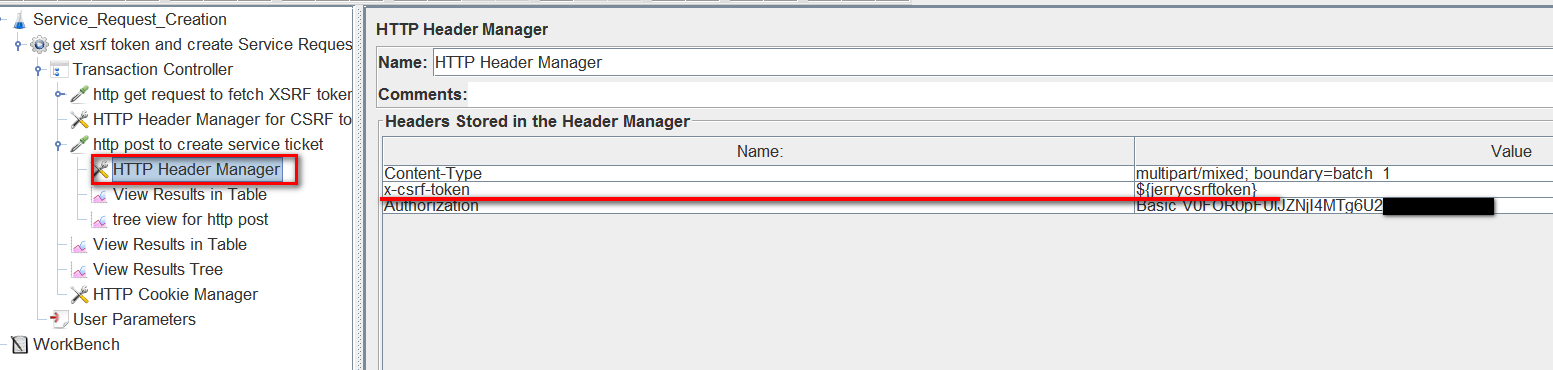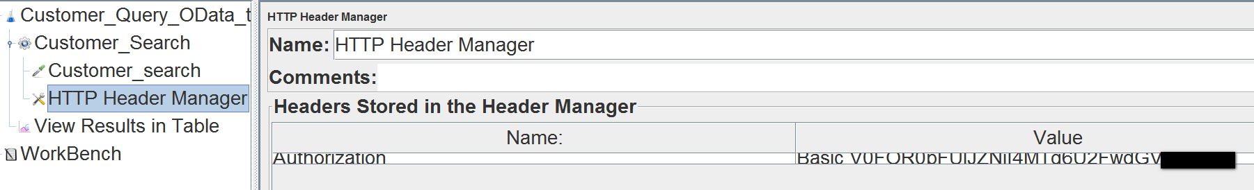 创建一个新的HTTP Header Manager,维护执行这个请求的Authorization信息。这里我使用Basic认证方式,即HTTP header名称为Authorization,值为用户名:密码经过base64编码之后的值。