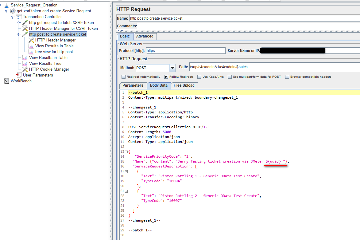这是我HTTP post请求的body内容,里面使用了jMeter自带的随机数发生器作为创建成功的Service Request的后缀。