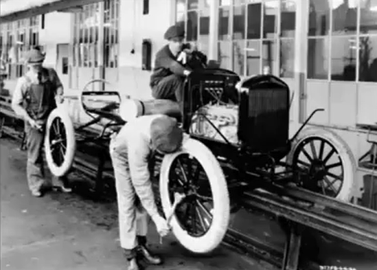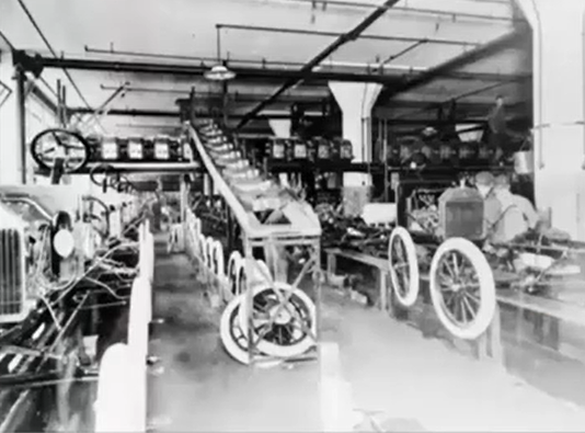 - 1910年,福特在高地公园建立的新工厂,第一次向世界展示了流水线大规模制造的效率:将制造一台 T 型车的时间从 728 分钟缩短至 93 分钟
