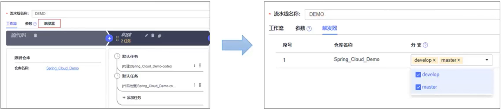 - 用户可以选择在云代码托管服务中指定仓库的分支作为触发器,当分支上有 push 请求时,会自动触发流水线执行