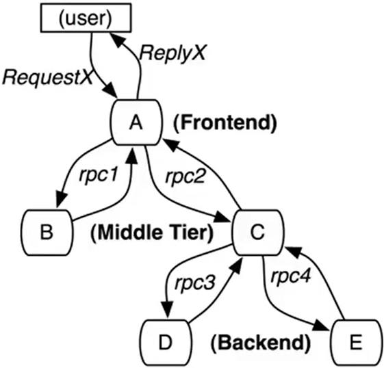 - 例如,下图展示的是一个5台服务器相关的服务,包括前端(A服务),两个中间层(B和C服务),两个后端(D和E服务)。当一个用户(这个用例的发起人)发起一个请求时,首先到达前端,然后发送两个 RPC 到服务器B和C。B会马上做出反应,但是C需要和后端的D和E交互之后再返还给A,由A来响应最初的请求。对于这样一个请求,简单实用的分布式跟踪的实现,就是为服务器上每一次你发送和接收动作来收集跟踪