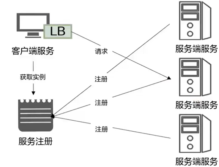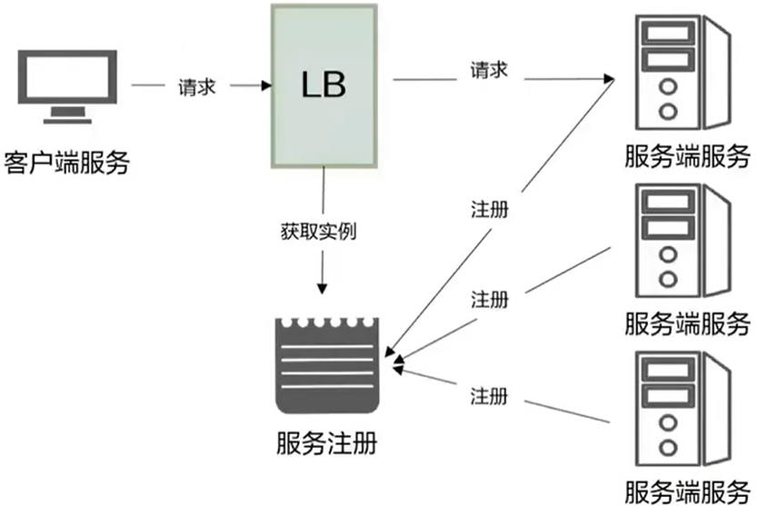 - 通过一个负载均衡器和服务注册中心相连,客户端只需要将请求发送给负载均衡器,对于负载均衡器会将请求转发给哪一台服务器,这都是由服务端的负载均衡器来完成的任务,他会向服务中心获取一个当前可以正常执行的服务器,然后从负载均衡器发送请求