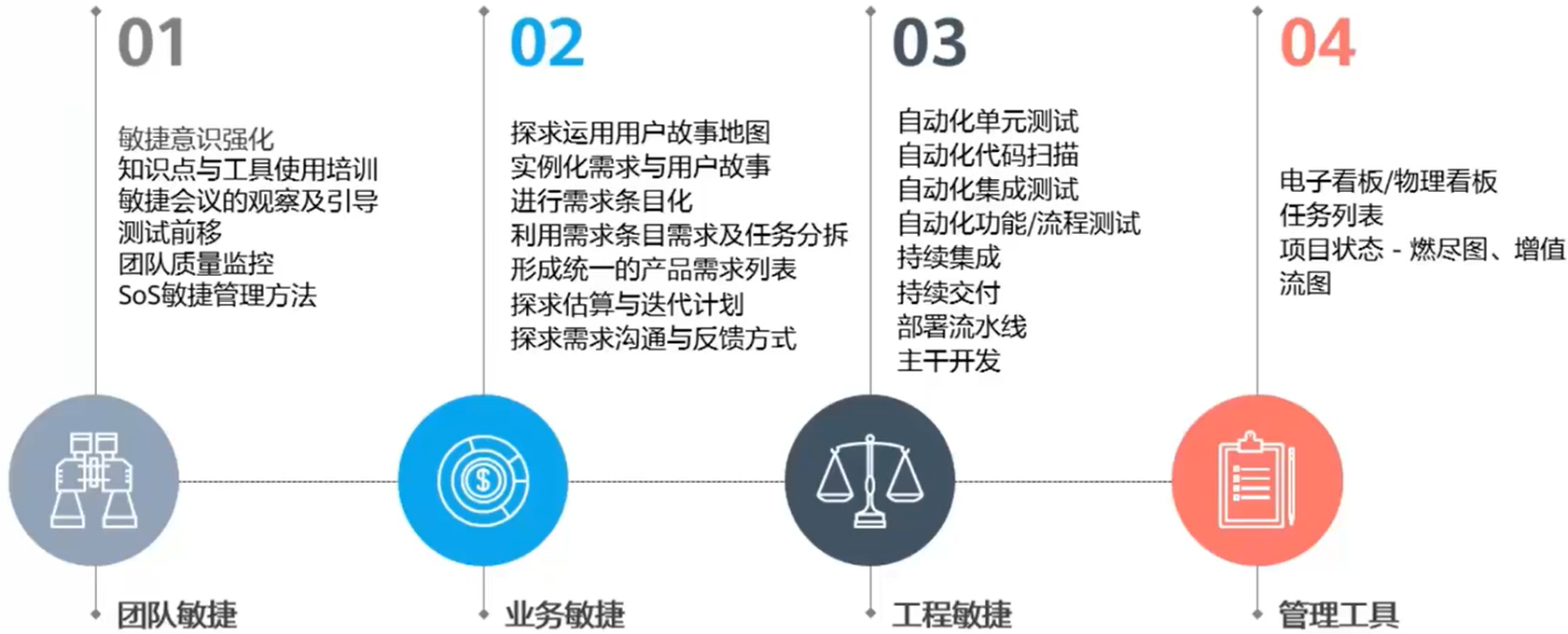 - 第四阶段闭环:目标是逐步实现所有业务线都以跨职能团队为最小组织单元,实现业务敏捷性,持续提升企业的市场竞争力