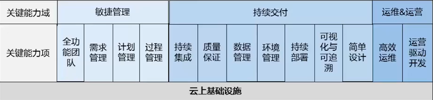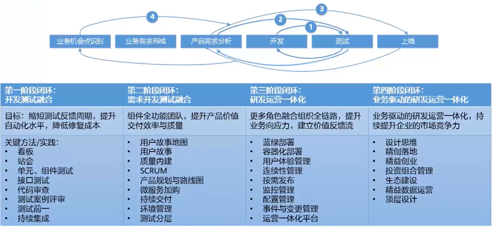 - 第三阶段闭环:研发运营一体化,实施产品自运营、自运维,打破了市场、研发、运维部门之间的壁垒,更多角色融入交付链路,提升业务响应力,建立价值反馈流