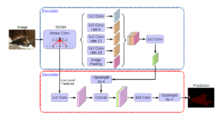 DeepLab 的 v3+:为改进 DeepLab v3 网络模型的缺点,2018 年 DeepLab 的 v3+网络模型被提出, 新版本的网络结构以改进版的 Xception作为基础网络,并在 DeepLab v3 的基础上加 入解码器,在解码器中直接将编码器的输出上采样4倍,使其分辨率和低层特征图一致, 对物体边缘信息有很好的保留。