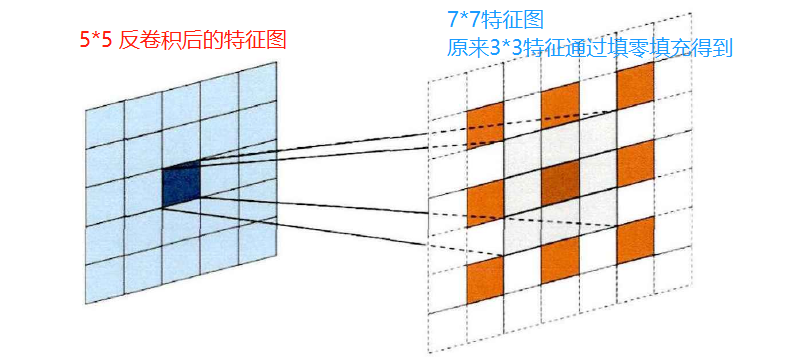 首先通过对输入分辨率为3*3的特征图进行补零,获取7*7的特征图(虚框区域),再经过一个3*3卷积核进行普通卷积运算即可得到5*5的特征图。