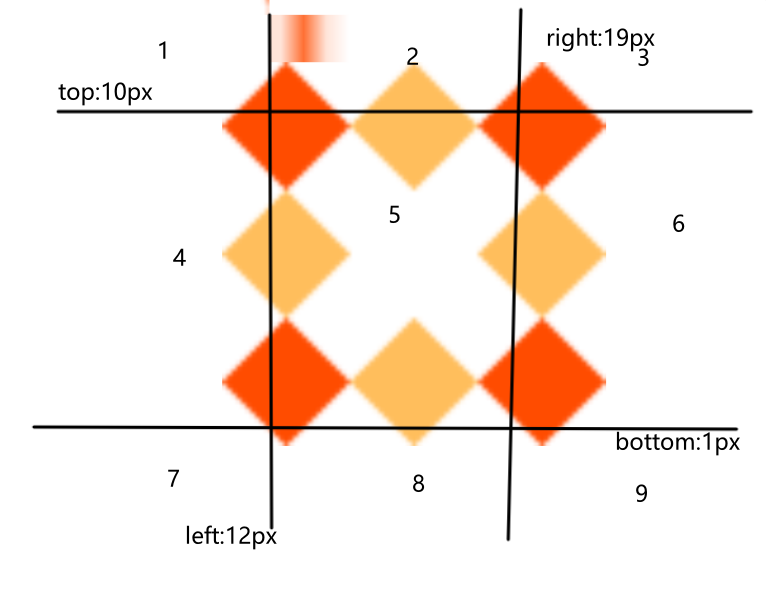 首先我们先来按照border-image-slice: 10 19 1 12;将背景图分解成9宫格。