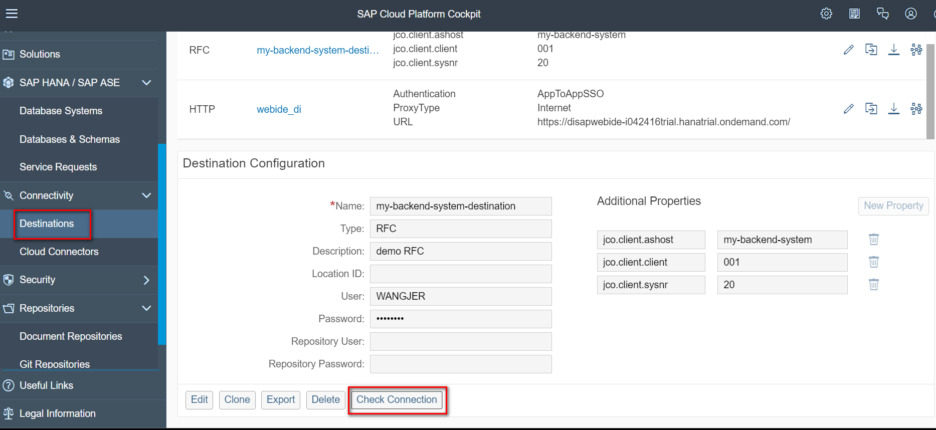 仿照下图的设置创建一个Destination。我的Destination名称为my-backend-system-destination, 这个Destination会在下一步被Java应用消费。注意User和Password需要维护成ABAP On-Premise系统对应的用户名和密码。