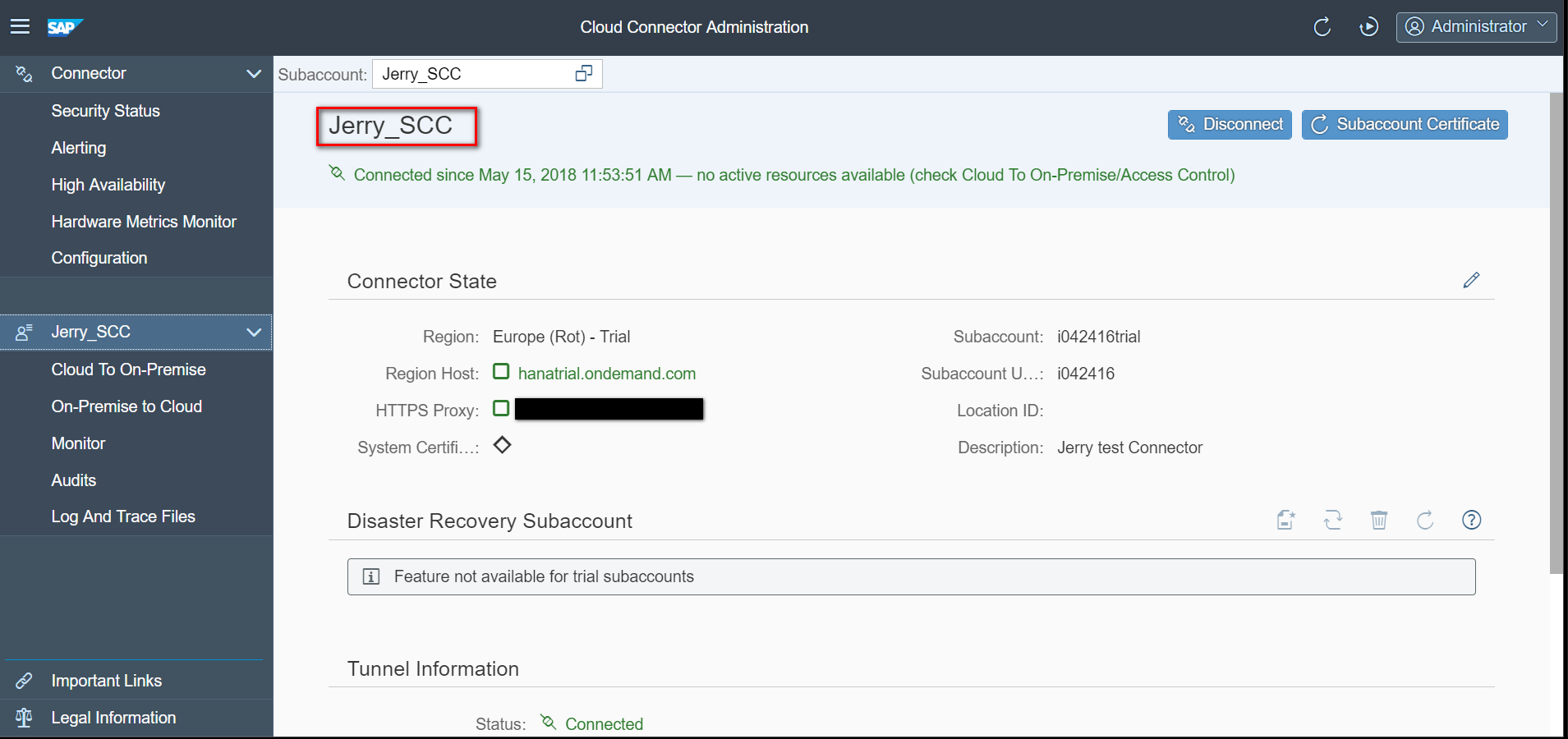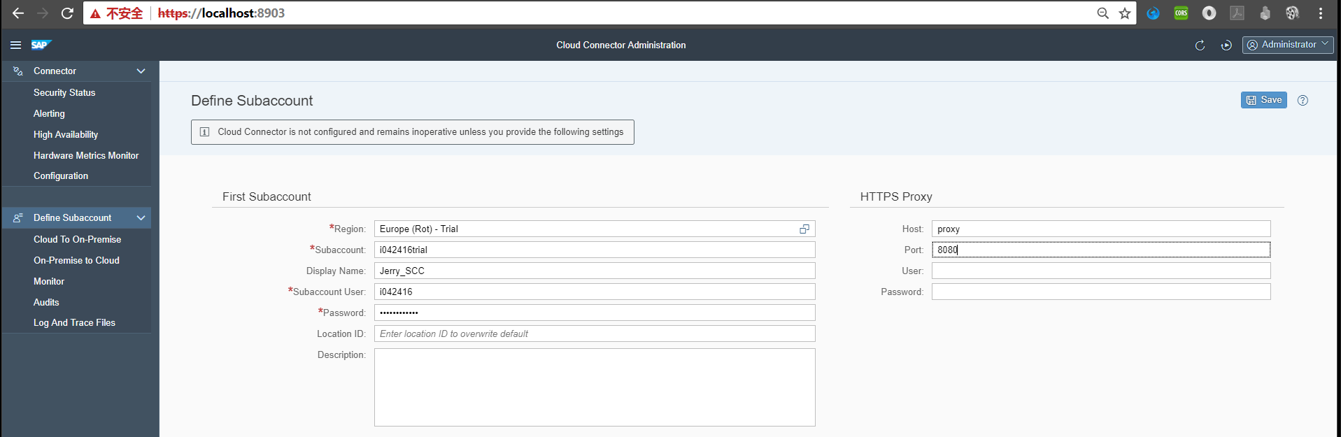 新建一个Connector实例,我命名为Jerry_SCC。Region和Subaccount需要指定成需要连接的SAP云平台的对应字段,这样才能将该Connector实例同对应的SAP云平台建立关联关系。