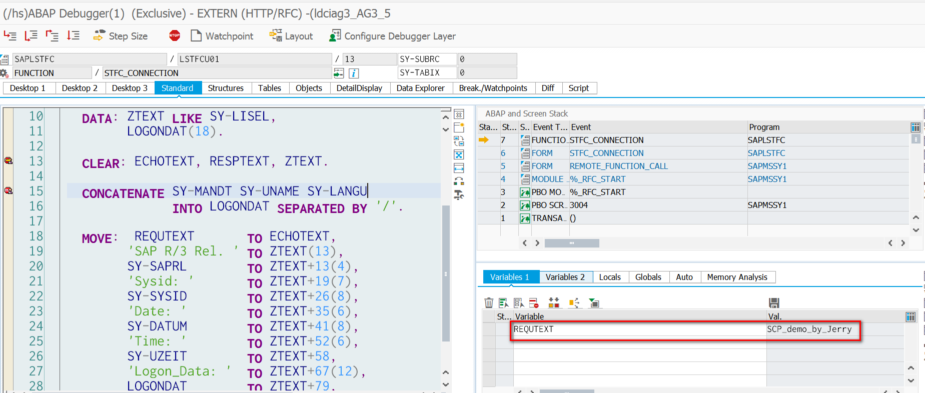 在ABAP系统的STFC_CONNECTION函数体内设置断点,在ABAP调试器里也能观察到从微信传进来的用户输入: