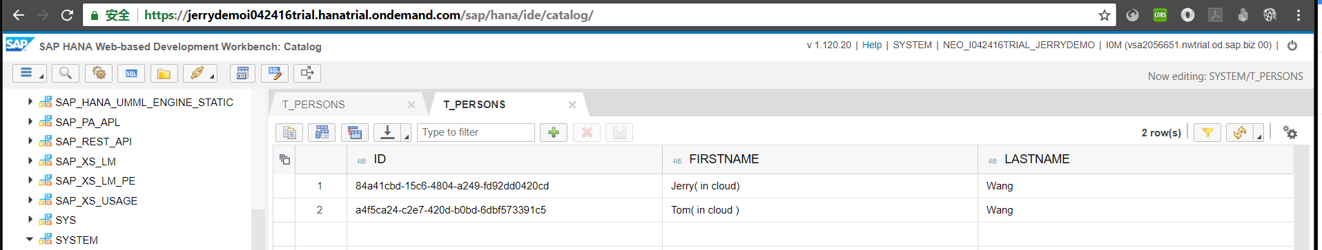 打开SAP云平台上的HANA Development Tool连接,从SYSTEM这个Schema下能观察到通过刚才运行在On-Premise系统上的Web应用插入的两条记录,说明从On-Premise系统写入SAP云平台数据库的尝试成功。