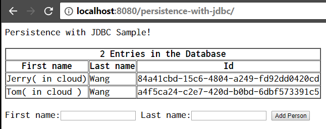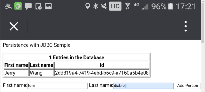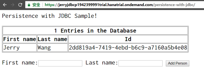 绑定成功后,即可通过Servlet UI提供的简易界面,向HANA数据库实例里插入一个Person记录 Jerry Wang。