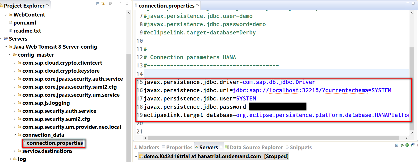 Java应用的代码无需做任何调整,仅需更改Server配置。修改Servers文件夹下的文件connection.properties, 明细如下,目的就是将该Server的数据库连接指向Cloud Connector上刚刚配置的Service Channel,通过Cloud Connector作为桥梁连接到SAP云平台上的HANA数据库。