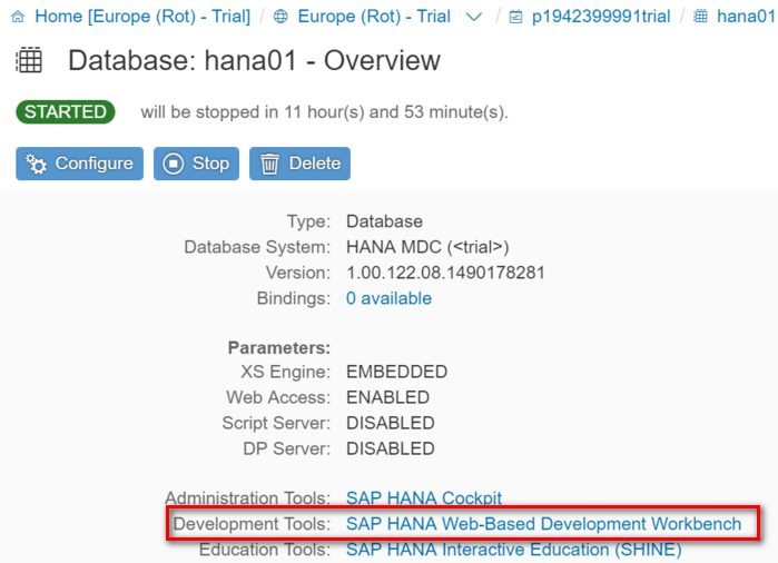 创建成功后,数据库实例状态变为STARTED,可以把其Development Tools的链接加到收藏夹里,后面也会用到。