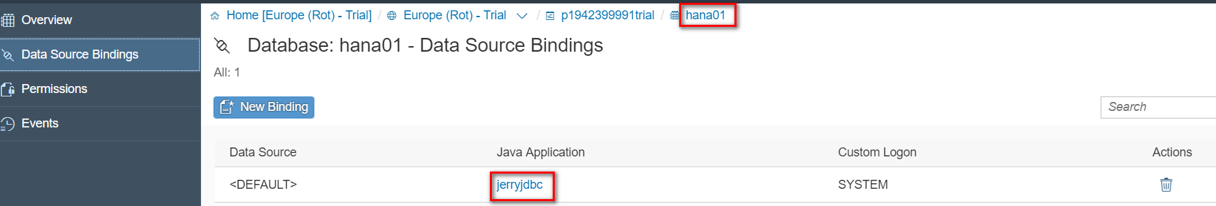 为此我们需要将jerryjdbc这个应用同第一步创建的HANA数据库实例hana01绑定起来。该绑定通过下图的Data Source bingdings页面创建: