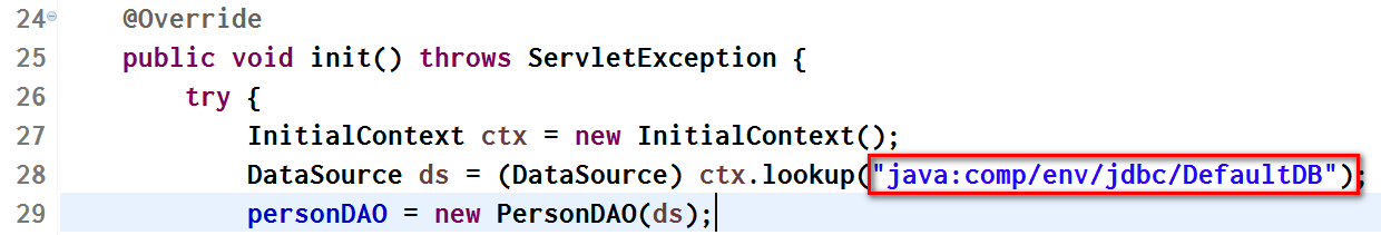 JDBC数据库DataSource实例的获取通过JNDI完成,该实例作为输入参数传入到DAO构造函数,所有接下来的JDBC操作均通过该DataSource进行。