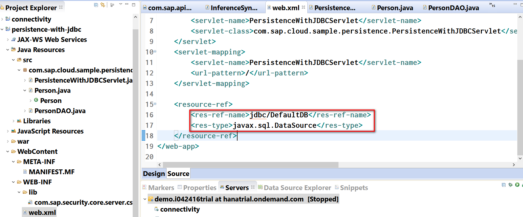此时仅仅通过上图web.xml的配置,Java应用还无法知道在SAP云平台上到底要操作哪个数据库实例。