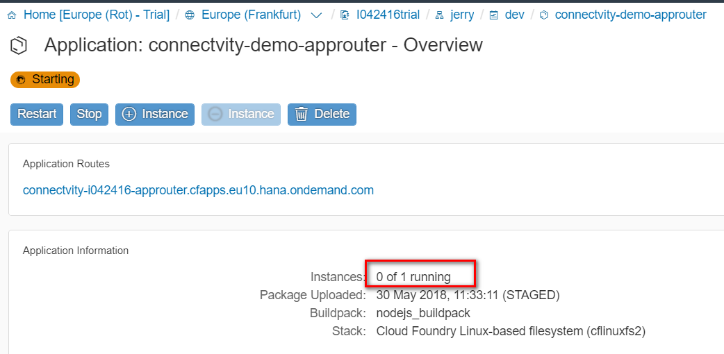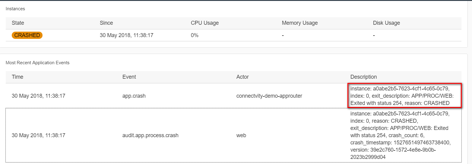 在cockpit遇到错误信息:instance: a0abe2b5-7623-4cf1-4c65-0c79, index: 0, exit_description: APP/PROC/WEB: Exited with status 254, reason: CRASHED