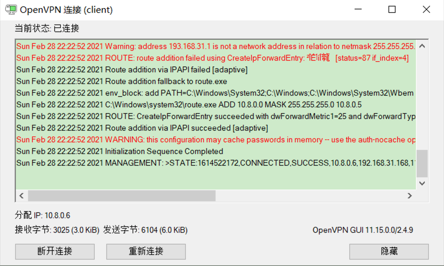 OpenVPN会分配一个IP地址给客户端,客户端会使用该虚拟网络IP地址与服务端进行通信。