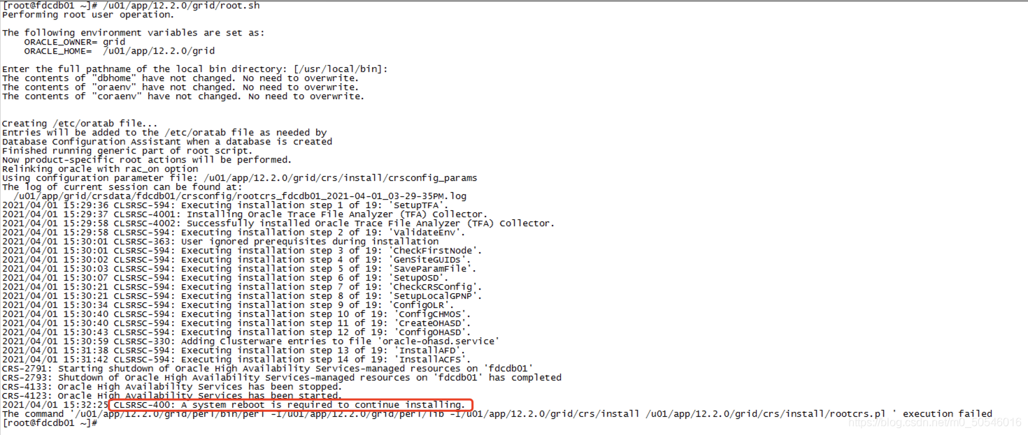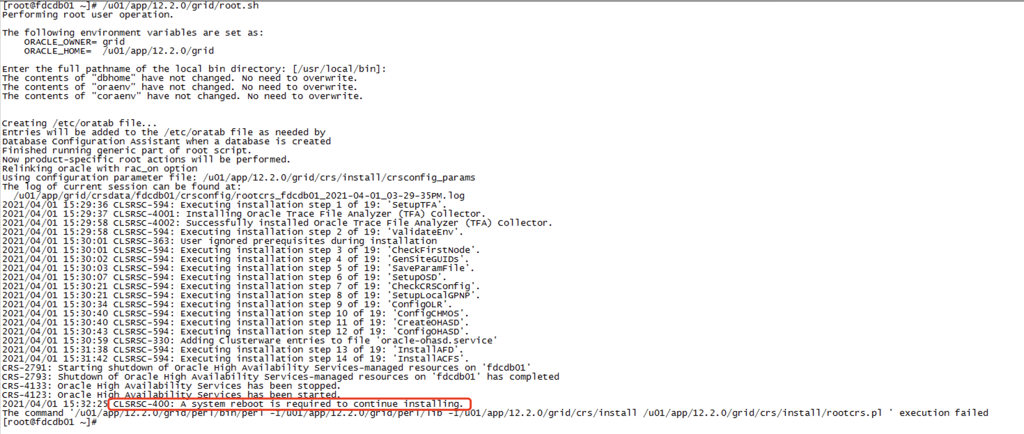 2021/04/02 06:12:50 CLSRSC-400: A system reboot is required to continue installing.