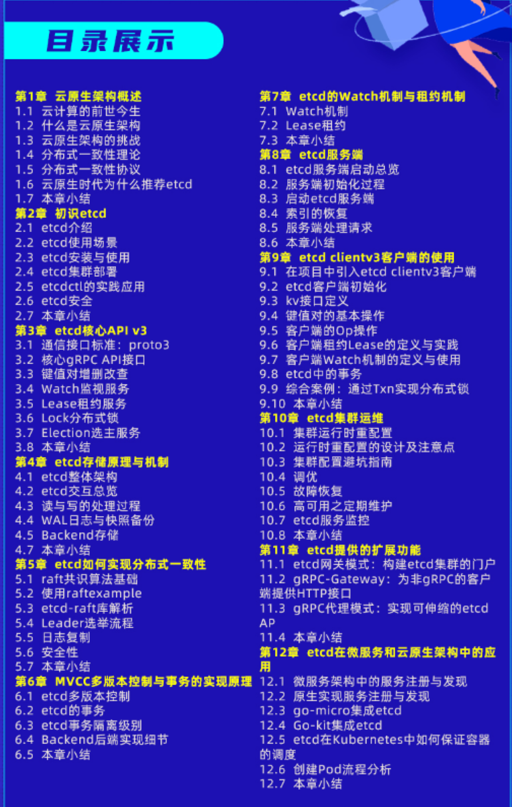这本书围绕etcd组件,从基础知识点到底层原理全面深入地展开介绍,最后结合了实践的案例。 主要包含如下的三个模块。