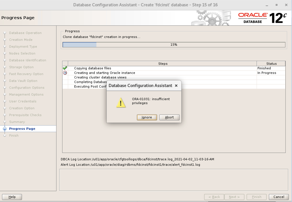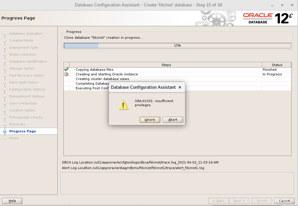 【摘要】 建库dbca报错:[BasicStep.handleNonIgnorableError:510] ORA-01031: insufficient privileges##怀疑可能是oracle用户缺少asmadmin组,授予组之后,点击ignoreusermod -a -G asmadmin oracleCDB实例创建完成。 创建PDB:SQL> create pluggable dat...