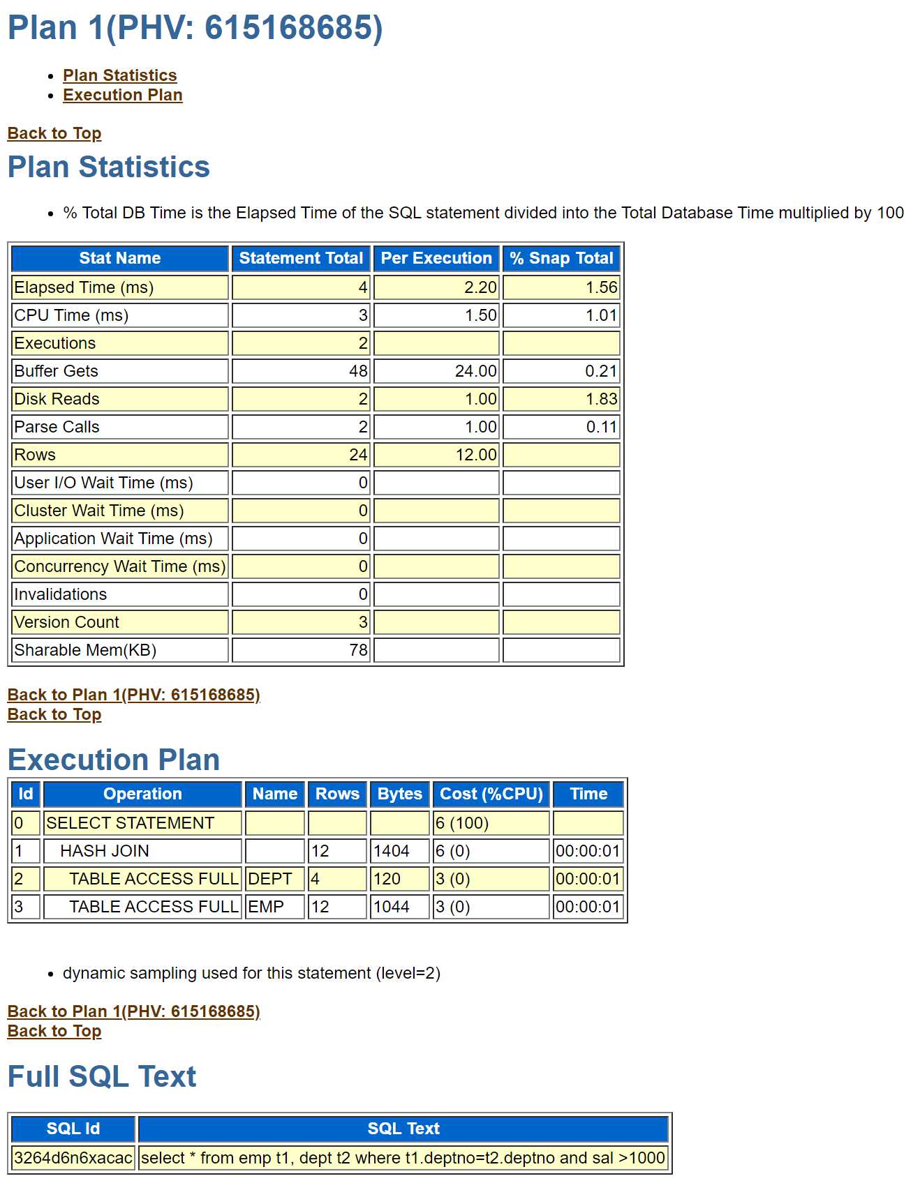 | 2 | TABLE ACCESS FULL| DEPT | 4 | 120 | 3 (0)| 00:00:01 |