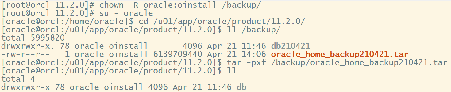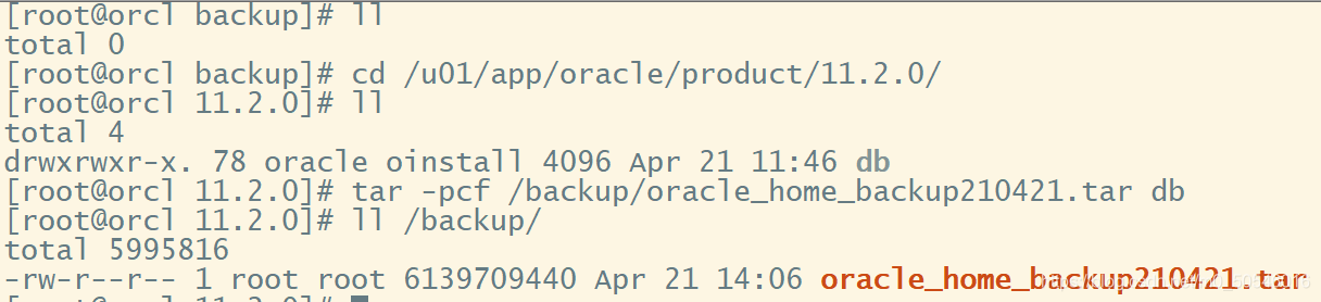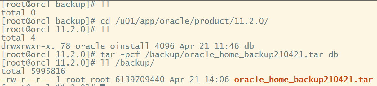 tar -pcf /backup/oracle_home_backup210421.tar db