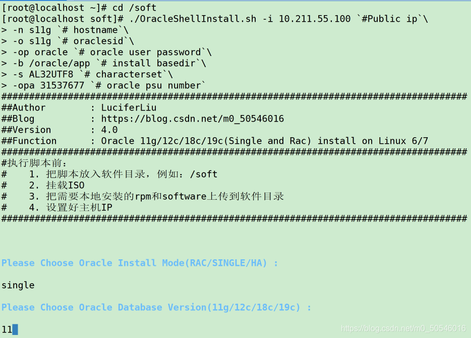 注意:可通过./OracleShellInstall.sh --help查看命令帮助