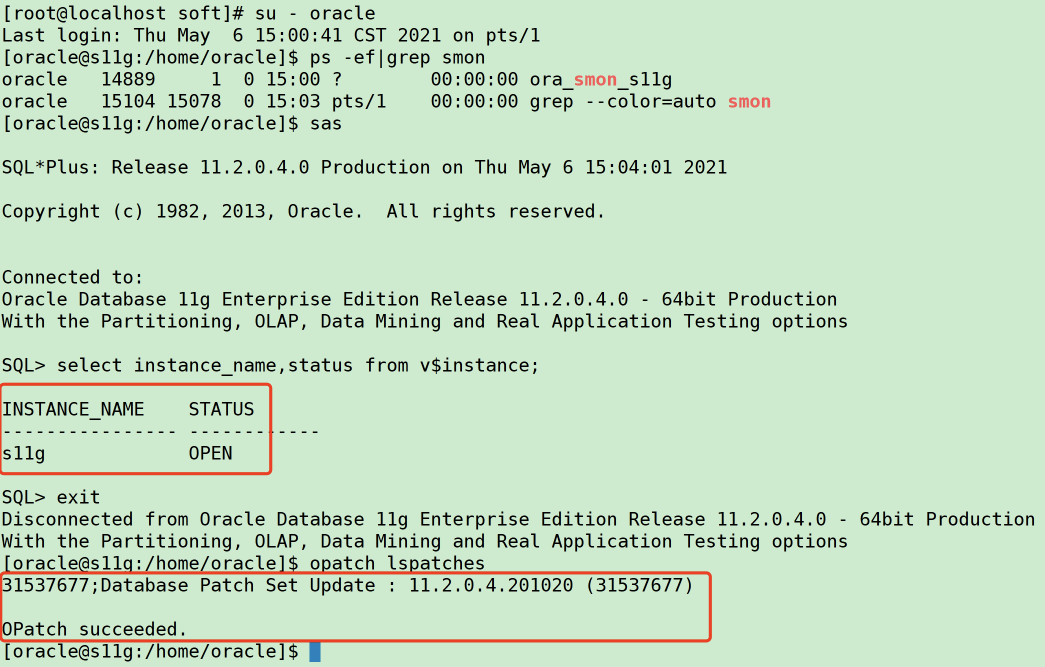 安装结束后,将自动创建好一个上述指定实例名为s11g的数据库实例,并安装上传补丁31537677。