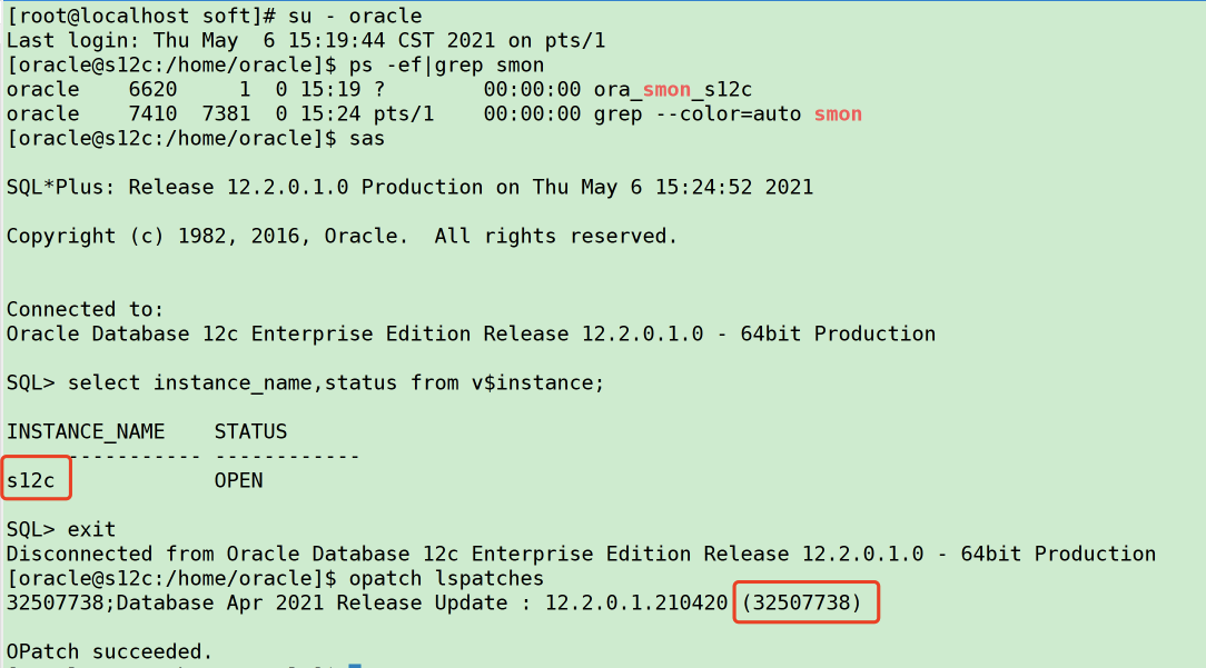 安装结束后,将自动创建好一个上述指定实例名为s12c的数据库实例,并安装上传补丁32507738。