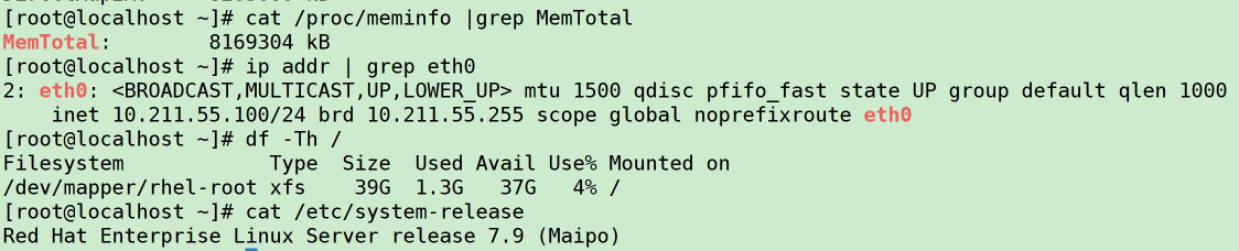 | redhat 7.9 | 8G | 50G | eth0 | 10.211.55.100 | /dev/sde,/dev/sdf |