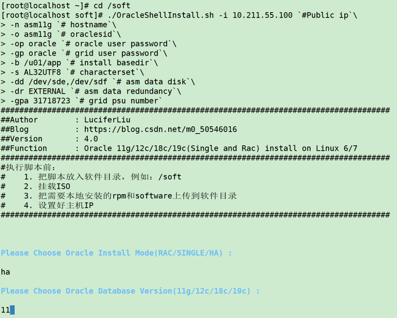 【摘要】 无人值守安装Oracle 11GR2单机集群,只需要25分钟?没错,通过脚本静默安装,只需要25分钟,包括安装补丁,建库。脚本下载链接:SHELL脚本进行oracle数据库一键安装,实现真正的无人值守安装 一、主机准备主机版本主机内存主机磁盘空间主机网卡主机IPASM盘redhat 7.98G50Geth010.211.55.100/dev/sde,/dev/sdf注意:1.主机内存不得低于...
