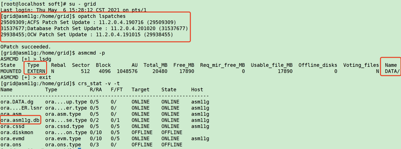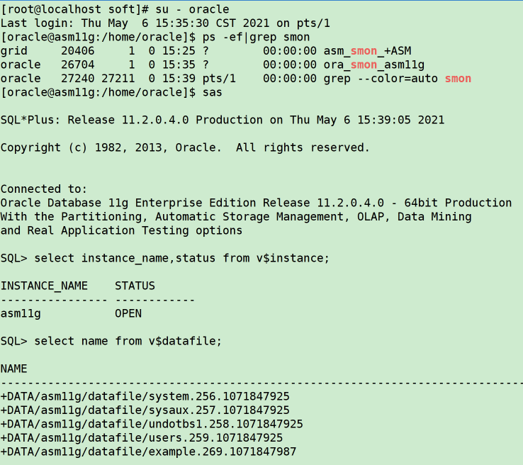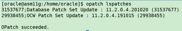 安装结束后,将自动创建好一个上述指定实例名asm11g的数据库单机集群实例,并安装上传补丁31718723。