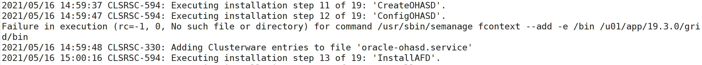 Failure in execution (rc=-1, 0, No such file or directory) for command /usr/sbin/semanage fcontext --add -e /bin /u01/app/19.3.0/grid/bin