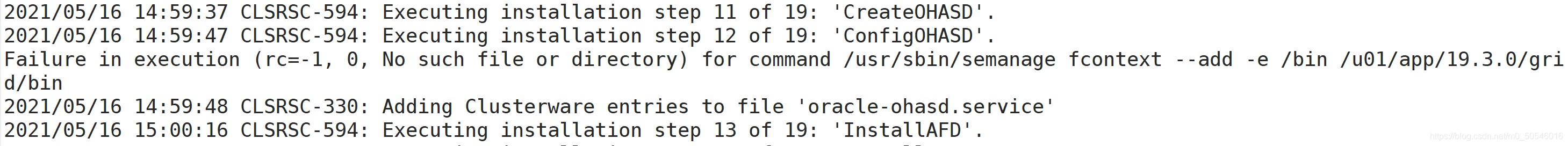 【摘要】  一、问题描述Linux8安装Oracle 19C RAC,执行root.sh时报错:Failure in execution (rc=-1, 0, No such file or directory) for command /usr/sbin/semanage fcontext --add -e /bin /u01/app/19.3.0/grid/binsemanage command ...