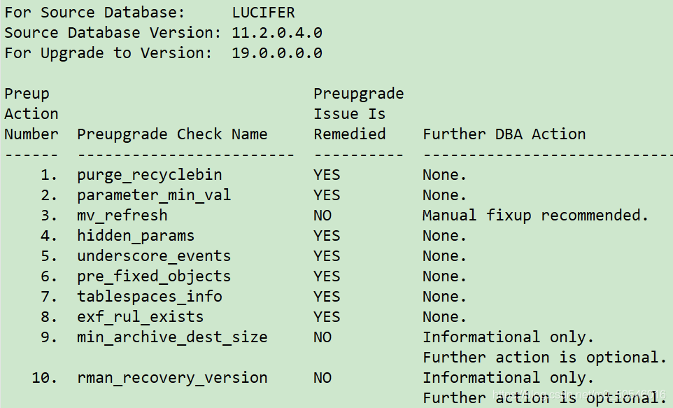 --如果有10g版本,建议您参考Oracle文档来修复10g版本,如果不这样做,升级完成后具有LOCKED的用户帐户。