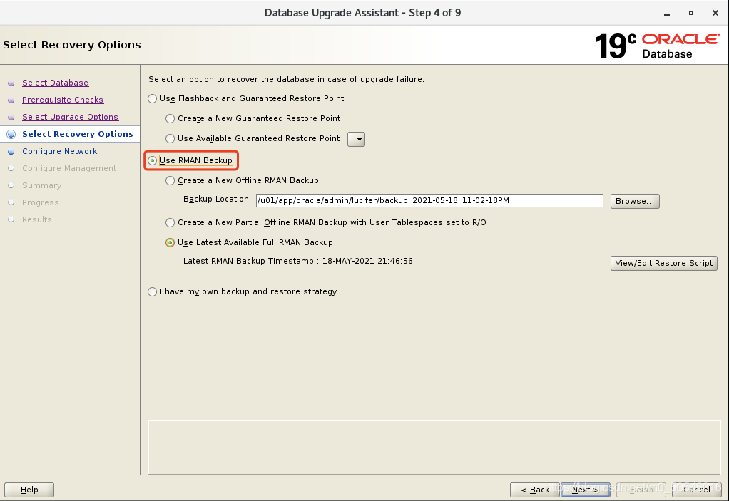 这里由于已经有RMAN备份,故而选择RMAN Backup,点击下一步。