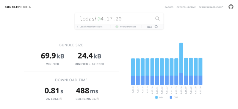 您可以使用来了解不同的库如何影响性能。您只需要将Vuejs库名称添加到这个奇妙的网站,您就会获得许多与网站数据相关的知识。 例如,我已经使用了lodash库,这里是信息。