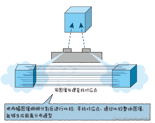 与此相对,立体相机中两个镜头的角度通常是固定的。根据左右镜头拍摄的图像的差距,就可以测算出所拍摄图像中的距离。首先,把用一个镜头拍摄下来的图像细分成一幅幅小图像。接下来利用图像处理的手法,调查一下分割好的图像相当于另一个镜头所拍摄图像的哪个部分。这样一来,就能知道图像某一部分会是另一个镜头中的哪一部分。虽然拍摄是在同一个地方,但镜头位置不同,所以会产生微小的偏差。对这个偏差进行几何学计算,就能算出图像中的距离。另外,对分割的图像分别地反复进行同样的操作,还能计算相机图像上任意一点的距离,从而制作出整体图像的距离分布模型。