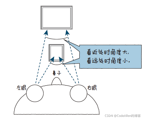 看近处的物体和看远处的物体时,两眼视线形成的角度(辐辏角)相差很大。离得远,角度就小;离得近,角度就大。大脑负责把眼睛的转动信息与影像进行合成,这样我们才能感觉到远近。