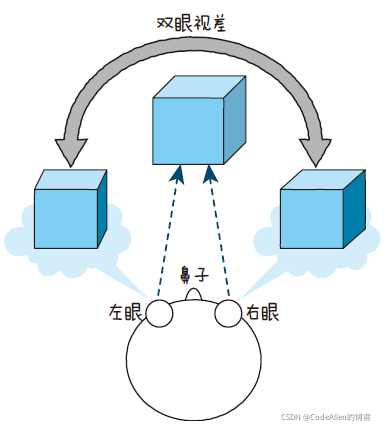 如下图,大家用双眼看物体时,左眼和右眼捕捉到的影像存在着微小的差异。这是因为左眼和右眼之间隔着几厘米的距离。凭借这段距离,人类就能获取捕捉物体立体影像时需要的信息。于是,从这两个有着微妙差距的位置中捕捉到的影像就在我们的大脑中得以合成,并作为立体影像被处理。