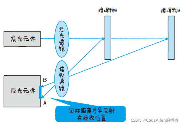 红外线测距传感器包括照射激光的部分和光接收元件。光接收元件负责接收从障碍物反射过来的光,不仅能测算ON/OFF 信息,即有没有照到光,还能测算光照到了光接收元件的哪里。