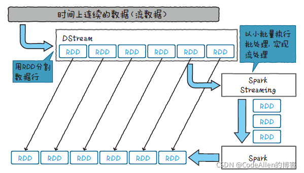 Spark Streaming 是用RDD 分割数据行的,它通过对分割的数据执行小批量的批处理来实现流处理。输入的数据会被转换成一种叫作DStream 的细且连续的RDD。先对一个RDD 执行Spark 的批处理,将其转换成别的RDD,然后按顺序对所有RDD 反复执行上述处理来实现流处理。