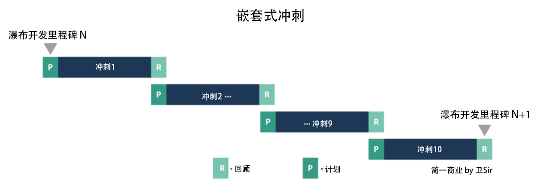 其中一些团队的交付周期长达 18 个月,他们将这个漫长的时间框架切成冲刺,然后将它们嵌套在瀑布流程中,如下图所示:
