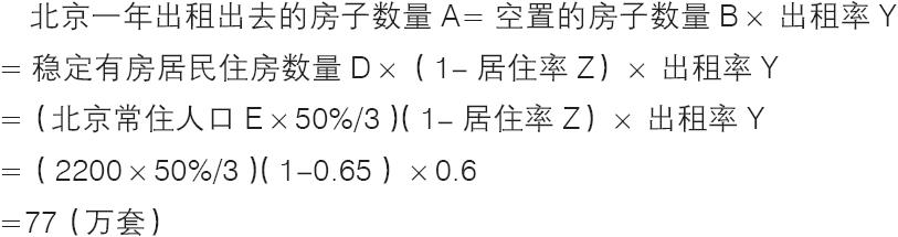 假设北京一年出租出去的房子数量为A,从供给角度直观来看,应该是空置的房子数量B×出租率Y,而空置的房子数量B=稳定有房居民住房数量D×(1-居住率Z),稳定有房居民住房数量D=北京常住人口E×50%/3注:假设稳定有房居民占北京常住人口的50%,假设稳定有房居民是3人住一套房子,此时用套作单位,假设出租率Y为0.6,居住率Z为0.65,