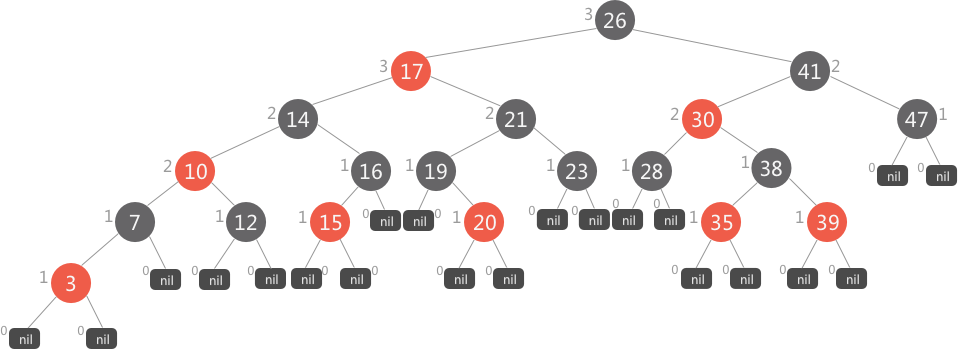 注意:图中每个结点附带一个整形数值,表示的是此结点的黑高度(从该结点到其子孙结点中包含的黑结点数,用 bh(x) 表示(x 表示此结点)),nil 的黑高度为 0,颜色为黑色(在编程时为节省空间,所有的 nil 共用一个存储空间)。在计算黑高度时,也看做是一个黑结点。