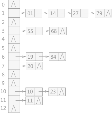 链地址法将所有产生冲突的关键字所对应的数据全部存储在同一个线性 链表中。例如有一组关键字为 {19,14,23,01,68,20,84,27,55,11,10,79},其哈希函数为: H(key)=key MOD 13,使用链地址法所构建的哈希表如图 3 所示: