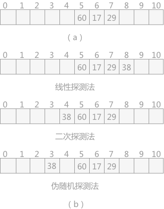 注释:在线性探测法中,当遇到冲突时,从发生冲突位置起,每次 +1,向右探测,直到有空闲的位置为止;二次探测法中,从发生冲突的位置起,按照 +12,-12,+22,…如此探测,直到有空闲的位置;伪随机探测,每次加上一个随机数,直到探测到空闲位置结束。