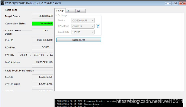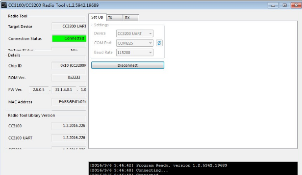 测试 CC3200 的射频性能时需要把芯片设置为 802.11 Bgn 的一种模式,设置信道,测试速率,可以使用 TI 官方 radiotool 工具。